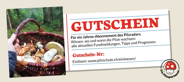 Gutschein für ein Jahres-Abonnement des Pilzradars. Auf Wunsch inkl. Zugang zur Fundmelder-Plattform.